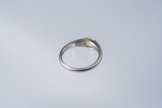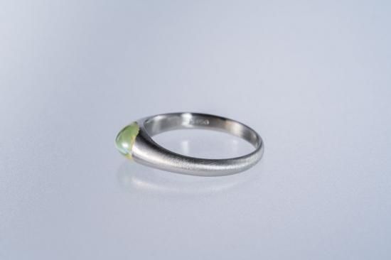 カヴォションカットの宝石が、リングと一体化するようにひっかかりなく留まっており、