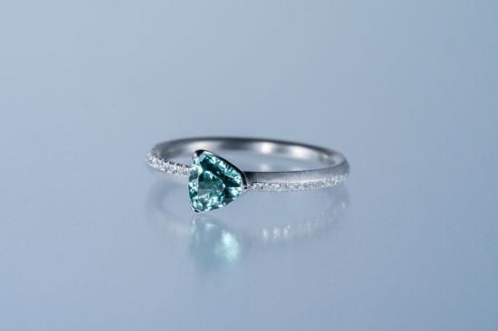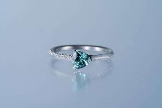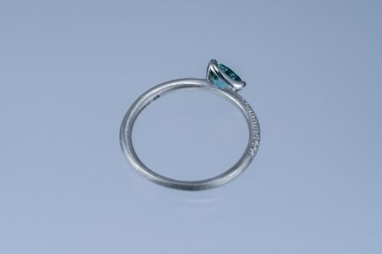 グレーを帯びた青緑色のラグーントルマリンをメインにしたリングです。